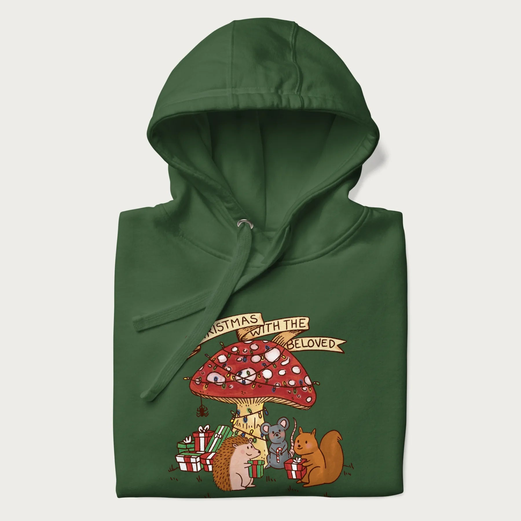 Celebrate the joy of the holiday season with our 'Christmas with the Beloved' hoodie. This enchanting design features a whimsical scene of woodland creatures- a hedgehog, a mouse, and a squirrel-gathered around a festively decorated mushroom adorned with twinkling Christmas lights. The heartwarming phrase 'Christmas with the Beloved' is beautifully displayed on a ribbon banner above the scene, capturing the essence of togetherness and holiday cheer.
