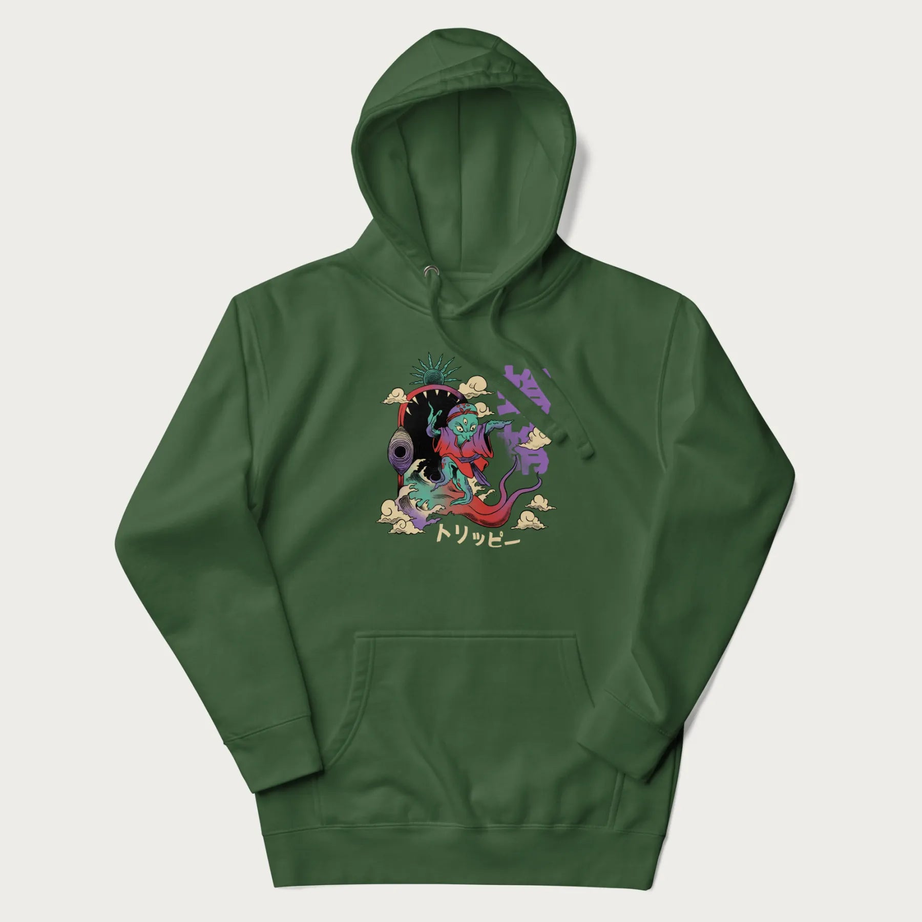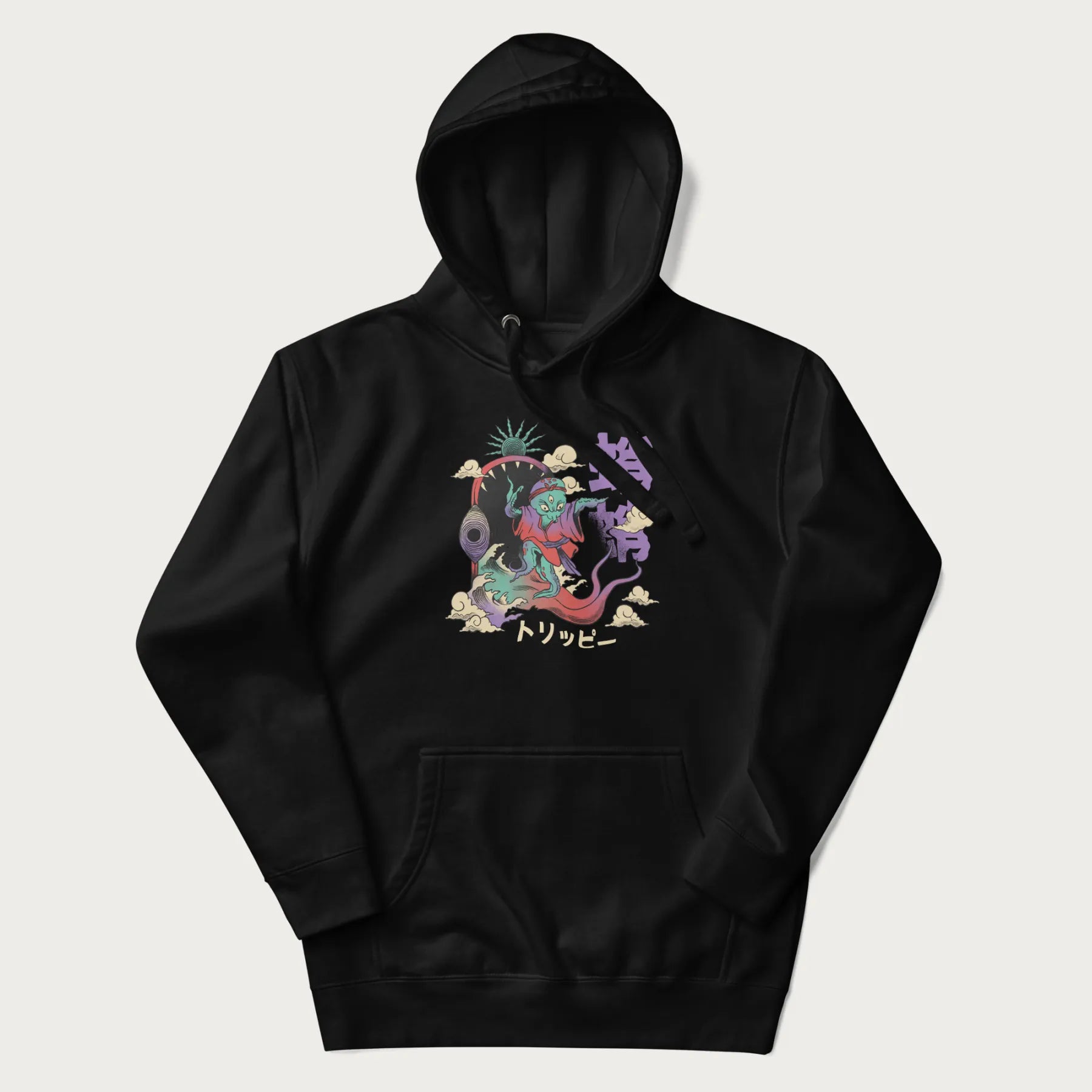 Dive deep into the realm of surreal art with our Psychedelic Japanese Octopus Hoodie. This hoodie with Japanese text features a mesmerizing depiction of an octopus, surfing out of the jaws of a psychedelic monster. The Japanese characters '蛸' (Tako, meaning 'Octopus') and 'トリッピー' (Torippī, meaning 'Trippy') enhance the aesthetic. This graphic hoodie is a statement piece that combines comfort with the allure of the mystical and the mysterious. Part of the Psychedelic Japanese Hoodie collection.